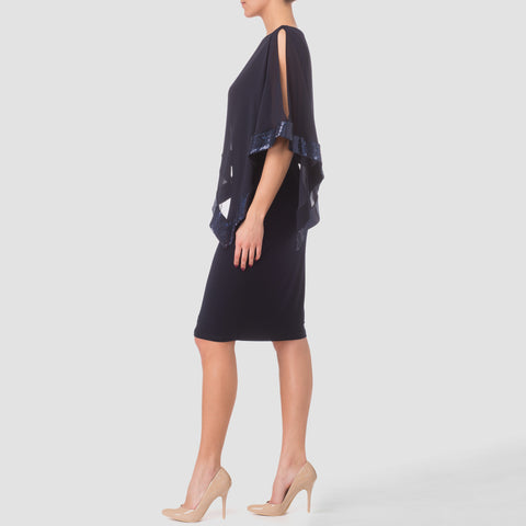 This Joseph Ribkoff sheath dress features a knee-length hem along with a shawl-like shrug with open sleeves and black sequin details along its hemline. This dress is lined and comes in a slip-on variety.
